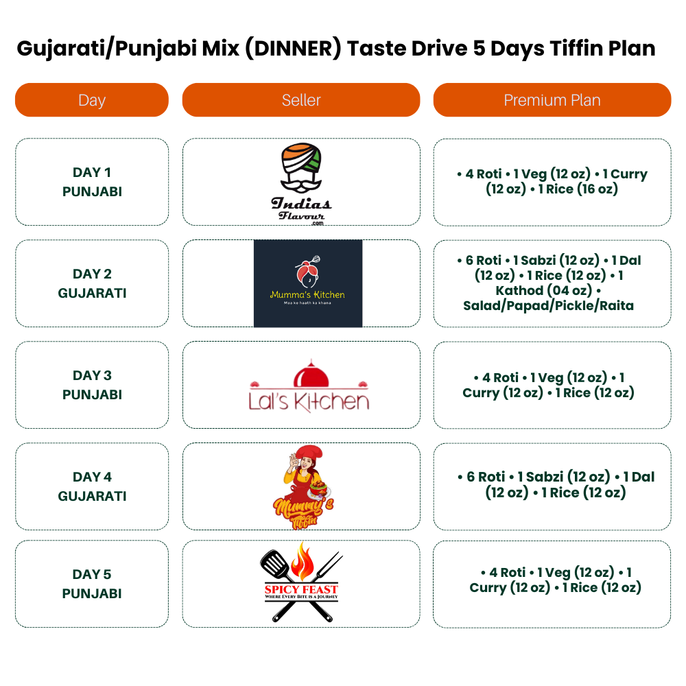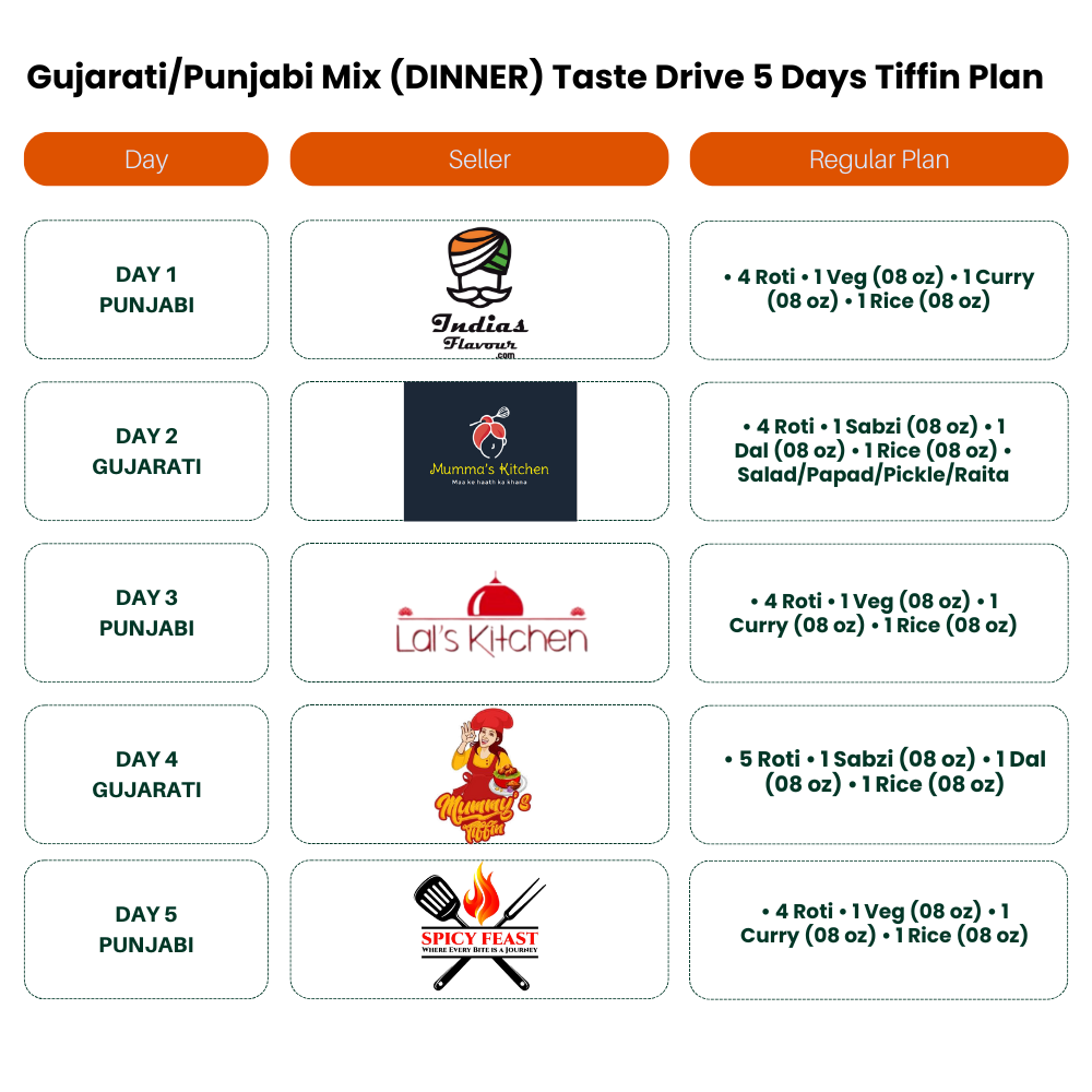 Order Gujarati/Punjabi Mix TiffinStash Weekly Taste Drive and get 5 veg trial tiffins in one convenient weekly order—featuring 3 days of Punjabi meals and 2 days of Gujarati meals at a special bundled rate. No need to order separate trials. Enjoy a balanced mix of homestyle Punjabi and Gujarati cuisine, then pick your favorite to continue with a weekly or monthly plan.