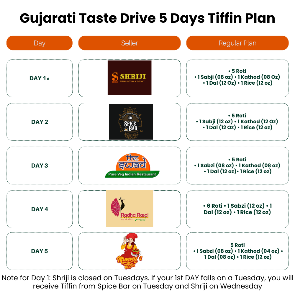Order Gujarati Taste Drive and get 5 Gujarati trial tiffins from 5 different sellers in just one weekly order at a discounted rate. No need to order separate trials—you can try them all and pick your favorite to subscribe for weekly/monthly plan!