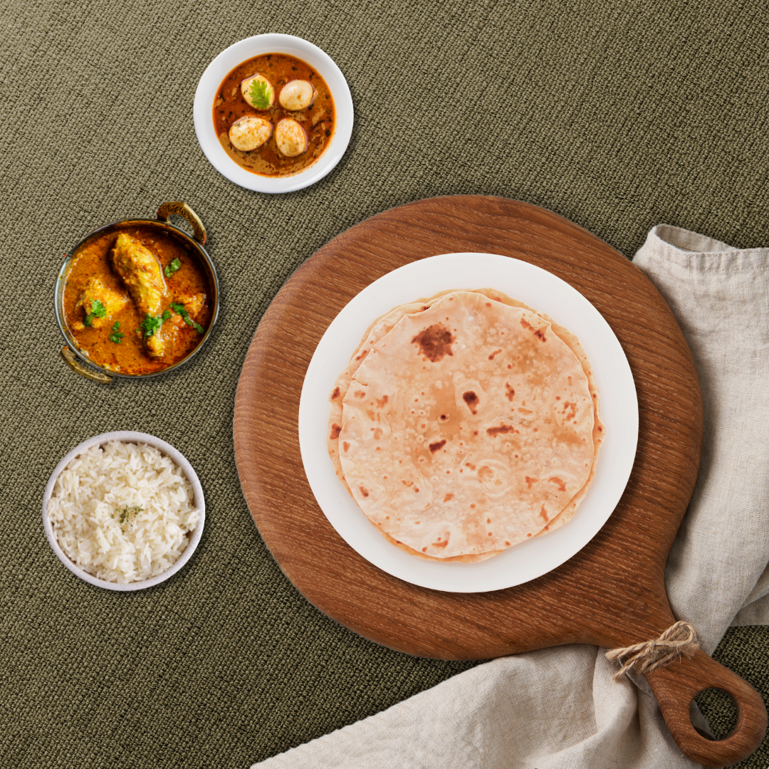 | Thu | 4 Roti • 1 Mutton/Fish/Prawns curry (12 oz) • 1 Dal (12 oz) • Roti Pachadi (04 oz) • 1 Rice (12 oz) |