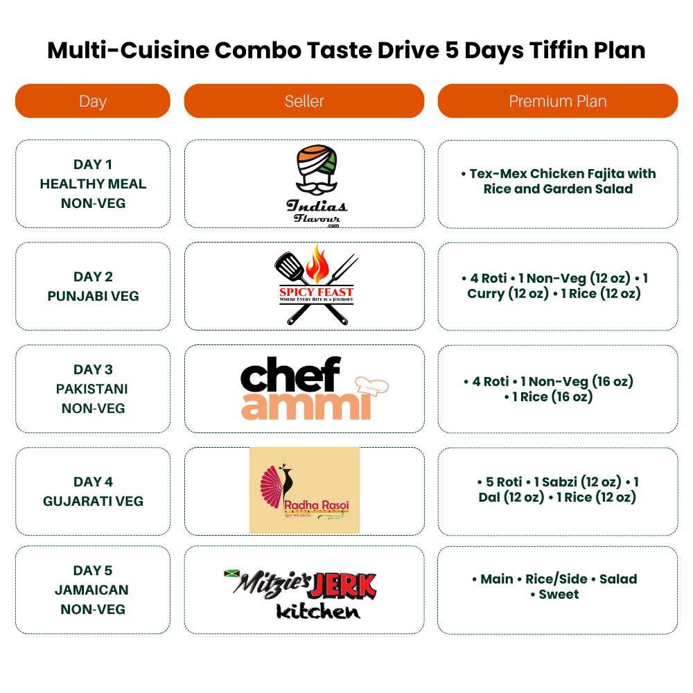 Order Multi-Cuisine Combo Taste Drive and get 5 trial tiffins from 5 different sellers in just one weekly order at a discounted rate—2 Veg days and 3 Non-Veg days.