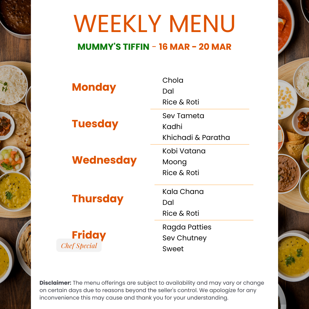 Below are the available tiffin packages and portion details. Portion sizes mentioned are per meal and may vary slightly based on the dish.
