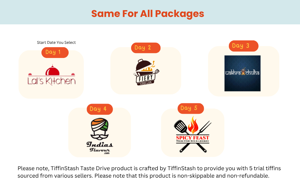 Order Punjabi Veg Taste Drive Option 2 and get 5 Punjabi veg trial tiffins from 5 different sellers in just one weekly order at a discounted rate. No need to order separate trials — you can try them all and pick your favorite to subscribe for a weekly or monthly plan!